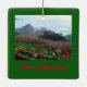 Dieses Weihnachtsschmuck hat eine landschaftliche, felsige 101 kalifornische Küstenstraße Szene. Fröhlich rote Blume versetzen den Hang in den Hang, während die Vista in die felsige Pazifikküste fegt, während die donnernden Wellen auf riesige Felsen aufbrechen. Dieses Originalfoto wurde in der Nähe des Rocky Point Restaurants südlich von Carmel-by-the-Sea und Garrapata Staat Beach entlang der Cabrillo Highway aufgenommen. Das Bild ist in Farbe, mit rotem "Frohe Weihnachten" Text, vor einem grünen Hintergrund.