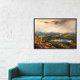 A scenic view captures a mountain range under a vast sky, with a serene lake nestled among lush green and rocky terrain. The contrasting colors of the landscape create a dramatic and peaceful atmosphere.