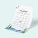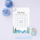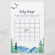 Dieses felsige Baby Bingo Spiel ist perfekt für eine Babydusche im Freien. Das Design zeichnet sich durch eine blau-grün gestrichene Wildnislandschaft mit Aquarellkiefern, Vögeln und Bergen aus.