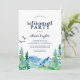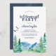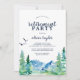 Diese Rocky Mountain Pensionssemble Party Einladung ist perfekt für ein Outdoor-Event. Das Design zeichnet sich durch eine blau-grün gestrichene Wildnislandschaft mit Aquarellkiefern, Vögeln und Bergen aus.