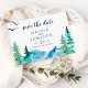 Dieses Rocky Mountain Ziel Save the Date Postcard ist ideal für eine Hochzeit im Freien. Das Design zeichnet sich durch eine blau-grün gestrichene Wildnislandschaft mit Aquarellkiefern, Vögeln und Bergen aus.