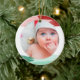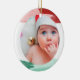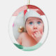 Julgransprydnad för din bebis, med ett foto på din bebis inuti en vattenfärgsram i grönt och rött. På baksidan, under "Min första jul," kan du skriva din bebis namn och födelseinfo.