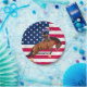 Ein Pferd und ein Reiter holen sich während eines Bullenreitwettbewerbs etwas Luft über eine amerikanische Flagge.