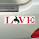 Ein lustiger Autoaufkleber für Rodeo-Liebhaber mit dem Wort Liebe in großen Blockbriefen und einer Silhouette eines Bronc-Fahrers, der das O ersetzt.