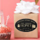 Dieses ovale "Roher Backyard Honey" Label ist für Imker im Hinterhof gedacht. "Honig" wird mit einem "geprägten" Schriftart in einem hellen metallischen Goldgradienten mit drei Bienenstöcken auf schwarzem Hintergrund geschrieben. Fügen Sie Ihren Namen, Honignettogewicht und den Ort hinzu.