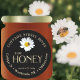 Ein schlichter weißer Tischtuch mit Honigbiene auf schwarzem Hintergrund mit blassgoldenem Text. "Honig" wird mit einem "geprägten" Schriftart in einem leichten metallischen Goldgradienten geschrieben. Geben Sie Ihren Namen, Honignettogewicht, Ort und Kontaktdaten ein. Und —Gute Bienenzucht!