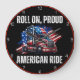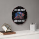 Diese patriotische Wanduhr zelebriert den Geist des amerikanischen Lastwagens. Es verfügt über einen lebendigen Sattelwagen mit amerikanischer Flagge, Set vor einem dynamischen rot, weiß und blau bedrückten Hintergrund. Der fett gedruckte Text "ROLL ON, PROUD AMERICAN RIDE" wird prominent angezeigt, was eine kraftvolle Aussage macht. Gerahmt von einem roten Rand, ist diese Uhr eine perfekte Hommage an LKW-Fahrer und nationalen Stolz.
