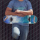 ein Rollbrett mit elektrischen Läufen in den Händen