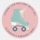 Fun pastellrosa Rolle Skaten Geburtstagsparty danke Ihnen Aufkleber mit einer Retro-inspiriert Abbildung eines aquamarinen Roller-Skate. Fügen Sie ein Dankeschön und ihren Namen dunkelblaue Typografie aquamarin.