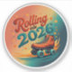 A vibrant retro sticker featuring a roller skate speeding into 2026 with warm gradients and star accents. Perfect for decorating laptops, water bottles, planners, phone cases, and party favors. Adds a fun, nostalgic New Year touch to any surface.