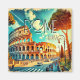 Eine künstlerische Darstellung des ikonischen Kolosseums in Rom, Italien. Die Szene erfasst die antike Struktur in atemberaubendem Detail, umgeben von einer lebhaften Straßenatmosphäre mit Bäumen und einem klaren blauen Himmel. Das Bild verbindet Realismus mit warmen, reichen Farben für einen klassischen künstlerischen Stil.