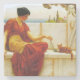 Dieses Design zeigt ein Gemälde des englischen Künstlers John William Godward (1861-1922), der zur neoklassizistischen Bewegung gehörte. Es zeigt eine elegante römische Frau in einer klassischen Landschaft, die mit ihrem Haustier-Kätzchen spielt: sie lächelt, während sie die Katze mit einer Pfauenfeder kitzelt. Die Frau und ihr Haustier sitzen beide auf einer Marmorbank, sie scheinen sich in einem Garten mit der Küste hinter ihnen zu befinden. Das Kätzchen hat Ingwerfell und die Frau trägt ein Kleid im Rot-Toga-Stil. Das Originalwerk wurde 1901 gemalt.