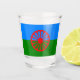 Dieses Design ist mit der romagnolischen Fahne, der internationalen Fahne der Romaner, ausgestattet. Die Fahne besteht aus einem Hintergrund von blau und grün, die Himmel und Erde repräsentieren; sie enthält auch ein 16-sprachiges rotes Chakra, oder ein Karikaturrad, in der Mitte, das die touristische Tradition des rumänischen Volkes darstellt und auch eine Hommage an die Flagge Indiens ist. Die Fahne wurde von den Vertretern verschiedener Roma-Gemeinschaften auf dem ersten Weltkongress der Romani (WRC) 1971 in Orpington gebilligt.