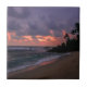 The fading sunlight creating beautiful pink and orange hues in the sky, making silhouettes of the palm trees and highlighting the gentle surf. Tranquil beach scene.