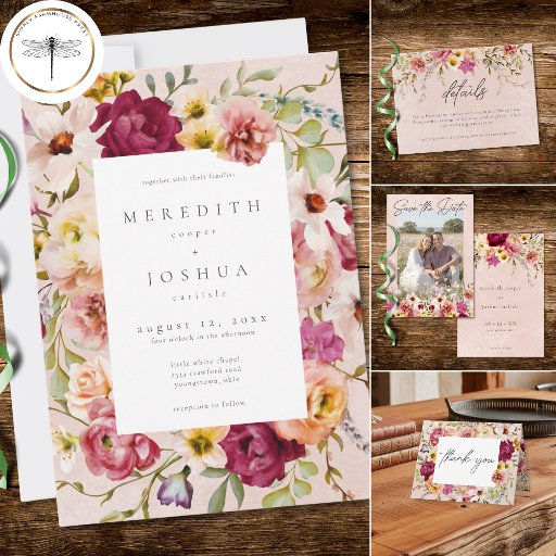Celebrate your love with this romantic burgundy and blush floral save the date card design. Featuring a lush watercolor border of spring blooms, it is perfect for a whimsical garden ceremony. This elegant aesthetic provides a stunning, high-end look for your modern wedding celebration. Created by Simply Farmhouse Press.