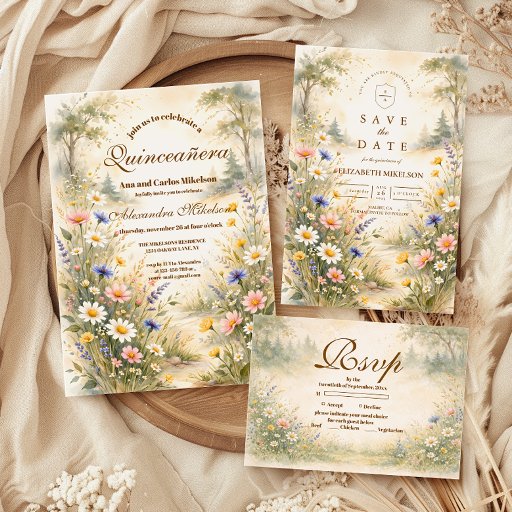 A joyful meadow of watercolor wildflowers blooms along the base of this elegant quinceañera design. Soft blush cosmos, delicate white daisies, buttery yellow blossoms, and airy blue florals rise against a warm parchment background, creating a fresh garden feel with timeless charm. Refined gold typography adds a graceful, celebratory touch while keeping the composition light and balanced. Perfect for a quinceañera celebration filled with romance, color, and countryside elegance.