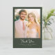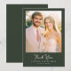 These wedding thank you cards feature a contemporary and elegant design with a central photograph bordered by a dark green frame, capturing an intimate moment between two individuals in a softly blurred outdoor setting. The color palette includes warm beige and light pink tones from the attire, contrasted with deep green accents, creating a romantic ambiance. Below the photo, a solid dark green background highlights white cursive and serif typography, expressing gratitude and personalization options for names and location. The overall mood is one of warmth and celebration, making these cards perfect for conveying heartfelt thanks after a special occasion.