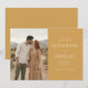 This wedding save the date features a split layout with a romantic outdoor photograph on one side and elegant text on a mustard yellow background. The color palette includes earth tones like beige, light brown, and muted green, complemented by the warm mustard hue. The typography combines modern serif and script fonts to create a sophisticated yet intimate feel, perfect for setting the tone for a memorable event. The design captures a serene and dreamy mood, ideal for couples looking to share their special moment in a stylish and heartfelt way.
