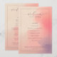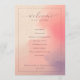 This wedding program features an elegant, minimalist design with a soft gradient background transitioning from peach to pink and purple hues. The layout is centered and vertically aligned, creating a balanced composition that highlights the ceremony schedule in clean, readable typography. A flowing script font introduces "welcome," while a bold serif typeface prominently displays customizable names at the bottom. The overall style exudes warmth and sophistication, making it perfect for formal weddings seeking a romantic and inviting atmosphere.