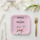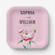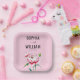 This elegant wedding plate features a soft pink background with a minimalist layout, creating a clean and balanced look. The design includes beautifully illustrated peonies in varying shades of pink, accompanied by delicate green leaves, adding a touch of nature's charm. A sophisticated serif font is used for the names and date, enhancing the romantic and refined aesthetic. Perfect for celebrating your special day, this plate combines floral motifs with modern typography to convey a mood of elegance and simplicity.