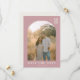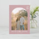 This wedding save the date card features a warm, romantic design with an arched top border framing a sunlit photograph of two individuals in a serene field. The soft pink background complements the natural tones of the landscape, creating a harmonious and inviting atmosphere. Elegant serif typography highlights the names at the top, while bold sans-serif fonts emphasize the date and "SAVE THE DATE" message below, ensuring clarity and focus. The overall style blends rustic charm with contemporary minimalism, making it perfect for couples seeking a personalized yet universally appealing announcement.