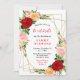 This fun and whimsical birthday party invitation features watercolor red, pink and orange roses with foliage on a gold geometric frame. The text combines handwritten script and serif fonts for a stylish and modern look. This is perfect for a spring or summer rustic birthday party.