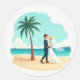 Enthält 20 kleine Aufkleber auf einem Blatt. Eine schöne Illustration eines Ehepaares in Hochzeitskleidung, die einen romantischen Moment an einem Sandstrand mit Palmen und einem klaren, blauen Ozean im Hintergrund teilen.