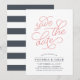 Einfach und elegant, unsere Romantic Request Hochzeit speichern Sie die Dattelkarte Features "Save the Date" in Korallenrosa Schrift Typografie mit einem schicken Herz in das Design gearbeitet. Fügen Sie Ihre Hochzeitsdetails inklusive Namen, Hochzeitstermin, Standort und Website in staubigen grau-blauen Schriften hinzu. Die Karten kehren zu modernen horizontalen Streifen in gedämpfter Marine und Weiß um.