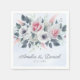 Elegante Servietten aus Hochzeitspapier mit Aquarellfarben in Rosa und Weiß Rosen und anpassbarem Text auf hellblauem Hintergrund.