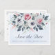 Elegantes, Save the Date Hochzeitsankündigung Postkartendesign mit Aquarellfarben-Rose und Blattwerk auf blass blauem Hintergrund.