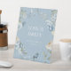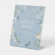 Romantische Dusty Blue Watercolor Blumenblume Hochzeitsfeier Liebe ist süße Tabletop Schilder mit staubigen blauen Zeltes und Delphinium-Blume mit Eukalyptusgrün mit Schmetterlingen. Fügen Sie Ihren eigenen Text in elegantem, modernem Kalligrafieschrift hinzu. Für Sie entworfen von Evco Studio www.zazzle.com/store/evcostudio