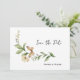 Romantische Field Blume Buttery Wedding Save the Date Einladung Eine schicke minimalistische Hochzeit Sichern Sie das Datum mit elegantem Drehbuch auf einem sauberen, weißen Hintergrund mit einer stilvollen Feld-Blume über die Länge der Karte. Personalisieren Sie Ihre Veranstaltungsdetails.
