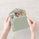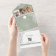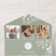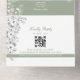 Diese grüne Hochzeitseinladung ist raffiniert und romantisch und präsentiert aufwändige, weiße Blumenbilder mit Platz für ein Paar Monogramm, drei kundenspezifische Fotos und einem QR-Code für mühelose RSVPs. Das elegante botanische Design und die sanfte Farbpalette machen es zu einem idealen Ort für Frühjahr- oder Gartenhochzeiten. Kein Umschlag erforderlich - falten, Siegel und versenden mit Leichtigkeit.