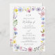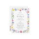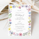 Feiern Sie Ihren besonderen Tag mit dieser charmanten Hochzeitsveranstaltung in Aquarellfarben mit einem handbemalten Kranz aus rosa, lila, blauen und gelben Blüten. Der zarte Blumenrahmen umgibt Ihre Hochzeitsdetails in modernen Drehbüchern und klassischen Serif-Schriftart und schafft ein zeitloses Design, das sich perfekt für rustikale, boho- oder Gartenhochzeiten eignet.