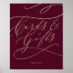 Dieses romantische bordeauxrote Kalligrafiekarte und Geschenkschild ist perfekt für eine einfache Hochzeit oder ein einfaches Brautparty. Das moderne klassische Design besticht durch extravagante Wirbel und skurrile Schnörkel mit herrlich eleganten, handgezeichneten Imitaten, die auf Champagner-Goldfolie-Typografie setzen. Die Textzeile am Ende des Zeichens kann mit dem Datum, den Namen der Braut und des Bräutigams personalisiert werden, oder mit einer kurzen Nachricht wie "Danke". Dieses Schild kann für eine Hochzeit oder für jede Veranstaltung oder jedes Party verwendet werden. Bitte beachten Sie: Dieses Design enthält keine echte Goldfolie. Es ist eine hochwertige Grafik, die wie Goldfolie aussieht.