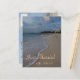 Einfache und süße Hochzeitsankündigung am Strand auf einer Postkarte für das Foto eines tropischen Strandes. Blauer Himmel, Sandstrand und türkisfarbener Ozean mit Platz zum Hochzeitshochladen Ihres eigenen Fotos.