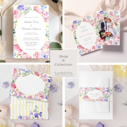 Diese florale Regency Stil Hochzeit Einladung Bauchband ist eine schöne Art, Ihre Einladung zu senden. Das Design besticht durch farbenfrohe Aquarellfarben und einen stilvollen gestreiften Hintergrund. Dies verspricht eine Touch von Eleganz aus der Regency-Zeit, die sich ideal für eine Blumenhochzeit im Frühjahr oder Sommer eignet. Sie können diese Bauchband für ein poliertes Hochzeitslook anpassen.