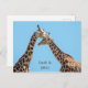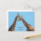 Personalisierte Postkarte mit einem Portrait von zwei Giraffen in liebevoller Pose gegen einen strahlend blauen Himmel. Sie können einfach mit den Namen eines Paares personalisieren und eine besondere Verlobung, Hochzeit oder Jubiläumsankündigung erstellen. Foto aufgenommen in San Diego, Kalifornien.