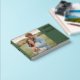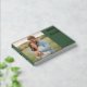 Dieser Umschlag für das Hochzeitsgästebuch zeigt ein geteiltes Design mit einem warmen, romantischen Foto von zwei Personen, die sich in einer Außenkulisse links umarmen, umgeben von hohem Gras und sanften Naturtönen. Die rechte Seite zeigt einen soliden dunkelgrünen Hintergrund mit eleganter, moderner Typografie in Goldgelb für anpassbare Namen und Details. Das Layout ist ausgewogen und schafft einen zeitgenössischen und dennoch rustikalen Charme, der Wärme und Intimität vermittelt und perfekt ist, um Liebe und besondere Momente zu feiern.