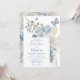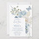 Romantische Dusty Blue Watercolor Blühende Hochzeitseinladungen mit dustig blauen Zeleste- und Delphinium-Blume mit Eukalyptusgrün und Schmetterlingen. Fügen Sie Ihren eigenen Text in elegantem, modernem Kalligrafieschrift hinzu. Für Sie entworfen von Evco Studio www.zazzle.com/store/evcostudio