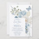 Romantische Dusty Blue Watercolor Blühende Hochzeitseinladungen mit dustig blauen Zeleste- und Delphinium-Blume mit Eukalyptusgrün und Schmetterlingen. Fügen Sie Ihren eigenen Text in elegantem, modernem Kalligrafieschrift hinzu. Für Sie entworfen von Evco Studio www.zazzle.com/store/evcostudio
