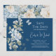 Romantische Dusty Blue Watercolor Blühende Hochzeit Sichern Die Date Card bietet staubige blaue Zeleste- und Delphinium-Blume mit Eukalyptusgrün und Schmetterlingen. Fügen Sie Ihren eigenen Text in elegantem, modernem Kalligrafieschrift mit Ihrer Hochzeitswebsite hinzu. Für Sie entworfen von Evco Studio www.zazzle.com/store/evcostudio