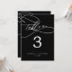 Diese romantische Kalligraphie dunkelschwarze 12x18" Tischnummer ist perfekt für eine einfache Hochzeit. Das moderne klassische Design besticht durch extravagante Wirbel und skurrile Schnörkel mit herrlich eleganter Typografie auf dunkelschwarzem Hintergrund. Die Karte druckt auf der Vorder- und Rückseite (beidseitig). Fügen Sie jede Tischnummer, die Sie benötigen, einzeln in Ihren Warenkorb.