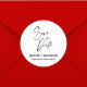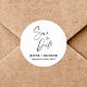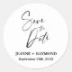 Die romantische Kalligrafie Wedding Save the Date Custom Classic Round Aufkleber verbindet zeitlosen Charme mit personalisierter Eleganz. Es ist mit exquisiter Kalligrafie gestaltet und trägt Ihre Namen und Ihren Hochzeitstag, was es zu einem perfekten Dekor für Einladungen, Umschläge oder Gastgeschenke Hochzeiten macht. Die klassische Rundform symbolisiert Einheit und Kontinuität und verkörpert das Wesen Ihres besonderen Tages. Dieser Aufkleber dient nicht nur als praktisches Instrument, um Ihre Hochzeit zu verkünden, sondern auch als wertvolles Mento, das die Romantik und Einzigartigkeit Ihrer Gewerkschaft festlegt.