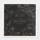 Eine romantische, schwarz-goldene Serviette mit einer schwarz-goldgrünen Weinrebe, in der Ihre Vornamen auf eine schwarze, in Gold handgeschriebene Platte mit Ihrem numerischen Hochzeitstermin darunter zentriert sind. Eine klassische moderne Hochzeitsnacht.