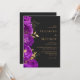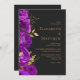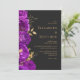 Diese romantische, stimmungsvolle, dunkelblumengeschmückte Hochzeitseinladung besticht durch ein violettes Set mit goldfarbenem Imitat. Die Namen des Ehepaares erscheinen im klassischen, goldfarbenen Serif-Schriftart, der übrige Text kursiv auf einem schwarzen Hintergrund.