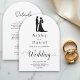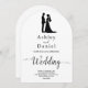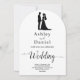 Diese elegante Schwarzweiß-Bogenhochzeit lädt zu einer modernen Hochzeit ein. Das einfache Design zeichnet sich durch eine elegante schwarze Kalligraphie und eine Braut- und Bräutigam-Illustration auf einem sauberen, weißen Hintergrund aus. Die Einladungskarte enthält die Hochzeitsdetails auf der Rückseite, anstatt für eine separate Kapselkarte zu bezahlen.