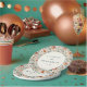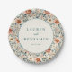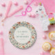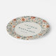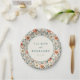 Diese elegante Hochzeitstafel zeigt ein altmodisches Blumenmuster mit sanften Pastellfarben, darunter Pfirsich, Rosa, Creme und gedämpftes Grün. Das Design zeigt stilisierte Pfingstrosen und zarte Blätter, die in einer symmetrischen, ausgewogenen Anordnung angeordnet sind, was ein üppiges Erscheinungsbild erzeugt. Ein zentraler, kreisförmiger Rahmen hebt anpassbaren Text in einer einfachen Serifen-Schriftart hervor, der vor einem sauberen weißen Hintergrund für Kontrast gesetzt ist. Perfekt, um Ihrer Hochzeitsfeier einen Hauch zeitloser Romantik zu verleihen, kombiniert dieser Teller klassische botanische Illustrationen mit modernem Charme.