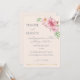 Diese Hochzeitseinladung ist ein sanftes und romantisches Design mit pastellrosa Hintergrund und floralen Dekorationen im Aquarellstil in Rosa und Pfirsichtönen, die von grünen Blätter in der oberen rechten Ecke hervorgehoben werden. Das Design ist elegant und minimalistisch, mit einer warmen und einladenden Farbpalette, die ihm eine zeitlose und raffinierte Ästhetik verleiht.