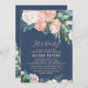 Diese romantische Peony Blume Blue Let's Party Einladung Card ist perfekt für ein elegantes Ereignis. Die Blumenmotive sind in Rosa, Pfirsich und Weiß gehalten, die Blume in den Aquarellfarben sind auf marineblau gehalten.